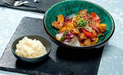 Stir-fried tofu with broccoli, bell peppers, and brown rice.
