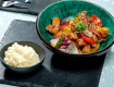 Stir-fried tofu with broccoli, bell peppers, and brown rice.